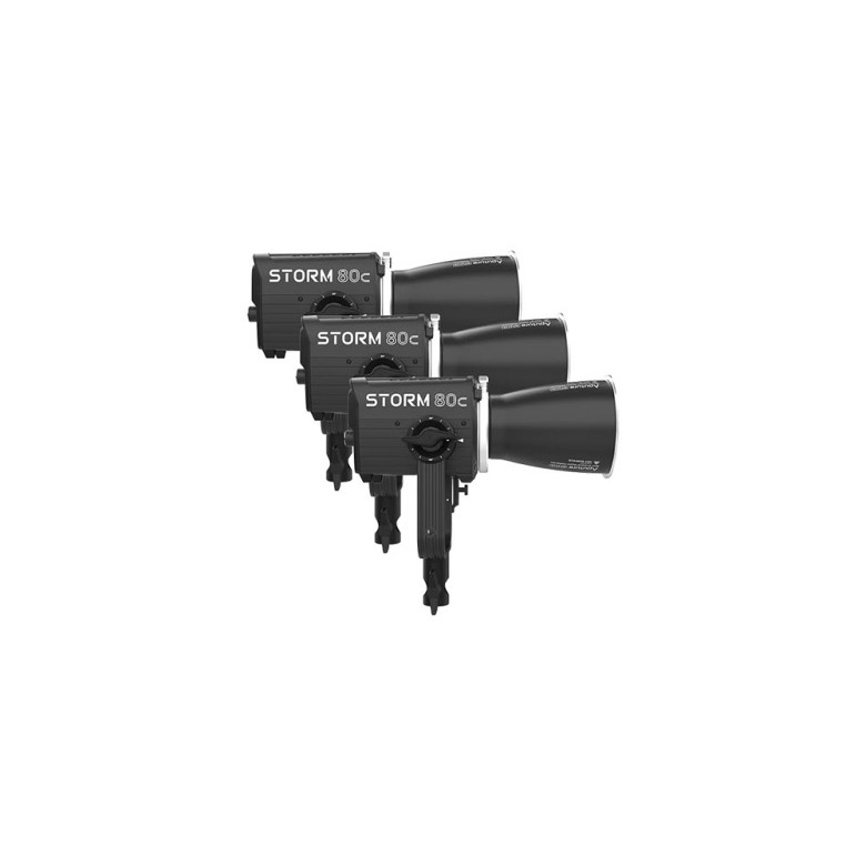 The Aputure STORM 80c 3-Light Kit is an all-in-one professional lighting toolkit—three STORM 80c lamps featuring the BLAIR-CG light engine, Hyper Reflectors, CF4 Fresnels with Barn Doors, Mini Lantern Diffusers, the Light Dome 40 Diffuser, Bowens Adapter, Handheld Bracket, battery cables, and mounting clamps, all in a hard-shell rolling case.