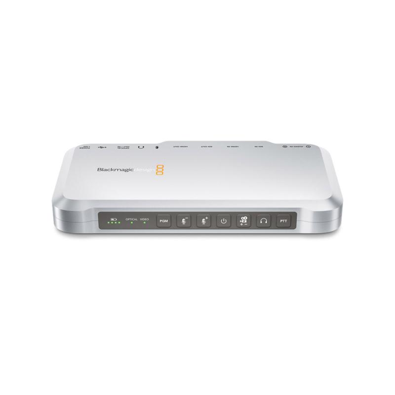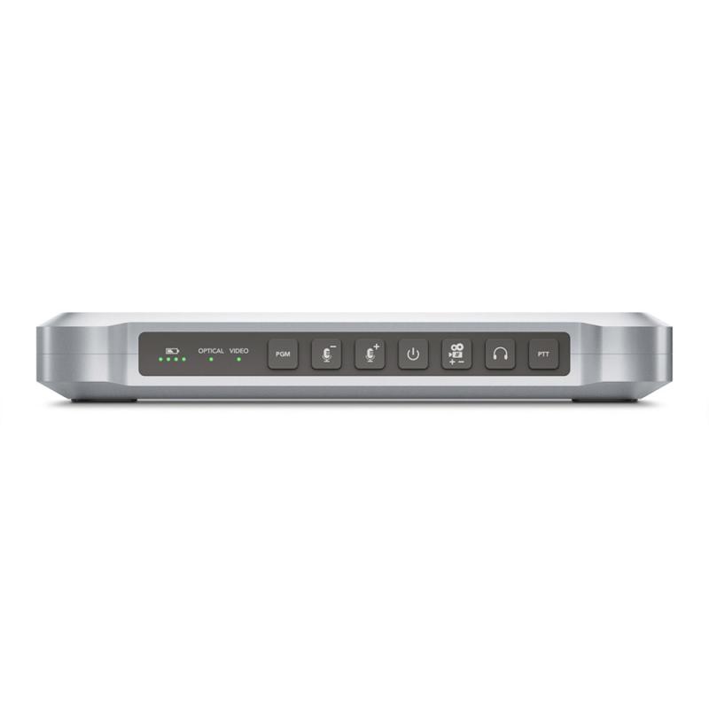 With an internal battery, the converter can be used at remote locations when the cameras are placed at far-off locations. Featured Talkback function allows the switcher operator to co-ordinate with camera operator via PC headsets or iPhone-compatible headphones. By embedding microphone audio into channels 15 and 16 of the camera optical fiber video output, the Talkback function listens to channels 15 and 16 of the optical fiber input on the headphones.