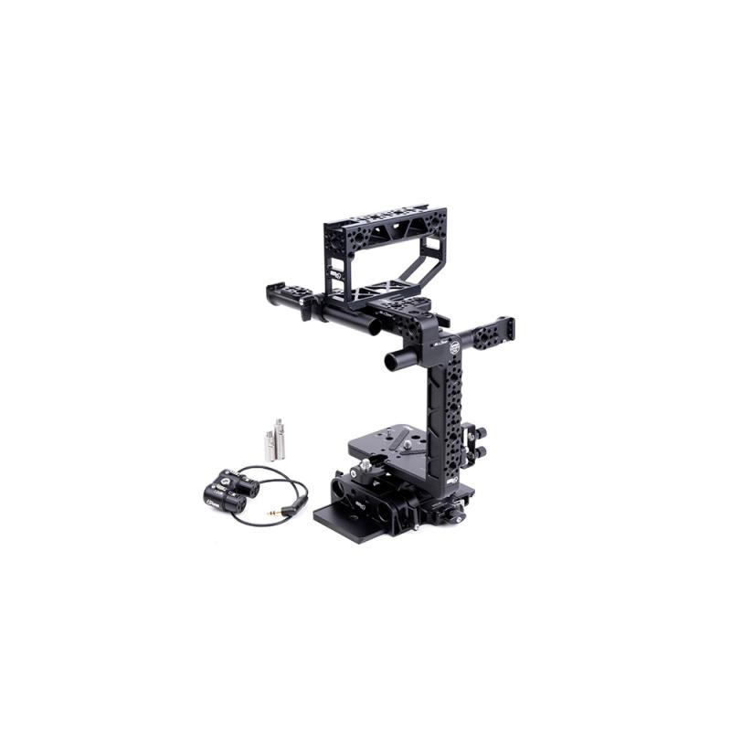 Form fitting cage with 1/4-20, 3/8-16, and M4x20mm threaded holes in several places along with shoe mounts and 15mm rod clamps. ARCA Swiss dovetail slot on top accepts included ARCA Top Handle and Top Plate. Two included 15mm accessory rods provide additional mounting for included AB-6 XLR adapter. Lower ARCA Swiss dovetail attaches to included baseplate and lens support adapter attaches to 3rd party lens adapters like Metabones, etc.