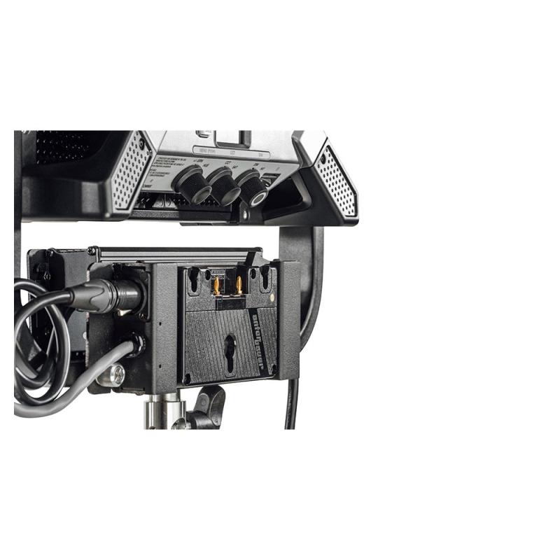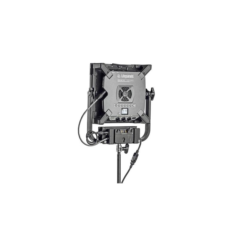 The Gold Mount Battery Bracket for Gemini 1x1 Panel from Litepanels accepts one 14.4V broadcast camera batteries that allow the Gemini 1x1 to run at 100% power. For on-set flexibility, the bracket mounts directly on the fixture. A 3-pin XLR cable is included.