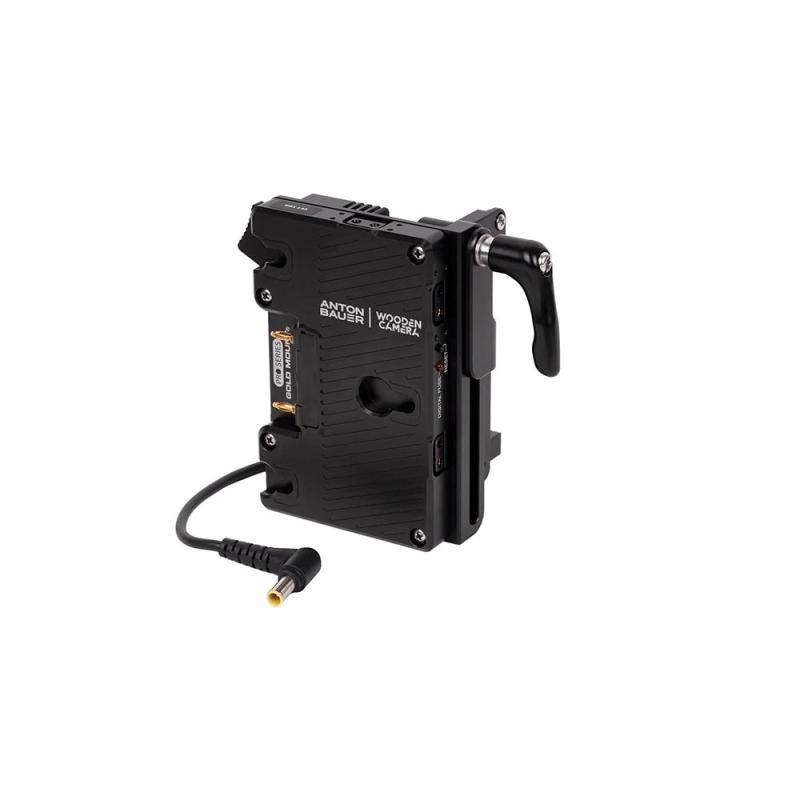 Battery Slide Pro Gold Mount (Sony FX6) utilizes a WC Pro Gold Mount plate which converts battery voltage to 19.5V for the camera, FX6 barrel connector, and a custom Battery Slide which attaches directly to the back of the camera without rods. This system retains access to the battery compartment and allows the Sony BPU series battery to be installed, giving the user the ability to hot swap Gold Mount batteries. To adjust battery plate position, loosen the thumbscrew and slide. Fits rear profile of the Sony FX6 for compact packing in camera case.
