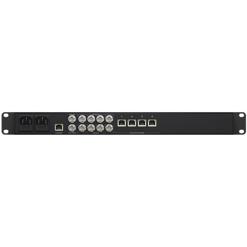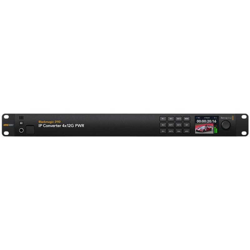 Blackmagic 2110 IP Converter 4x12G PWR lets you add SMPTE-2110 IP video to 12G-SDI broadcast equipment. It features 4 independent bidirectional 12G-SDI to SMPTE-2110 IP video converters using RJ-45 10G Ethernet connections which can also provide power. Its 1RU design includes a control panel with LCD and supports HD and Ultra HD standards up to 2160p60.