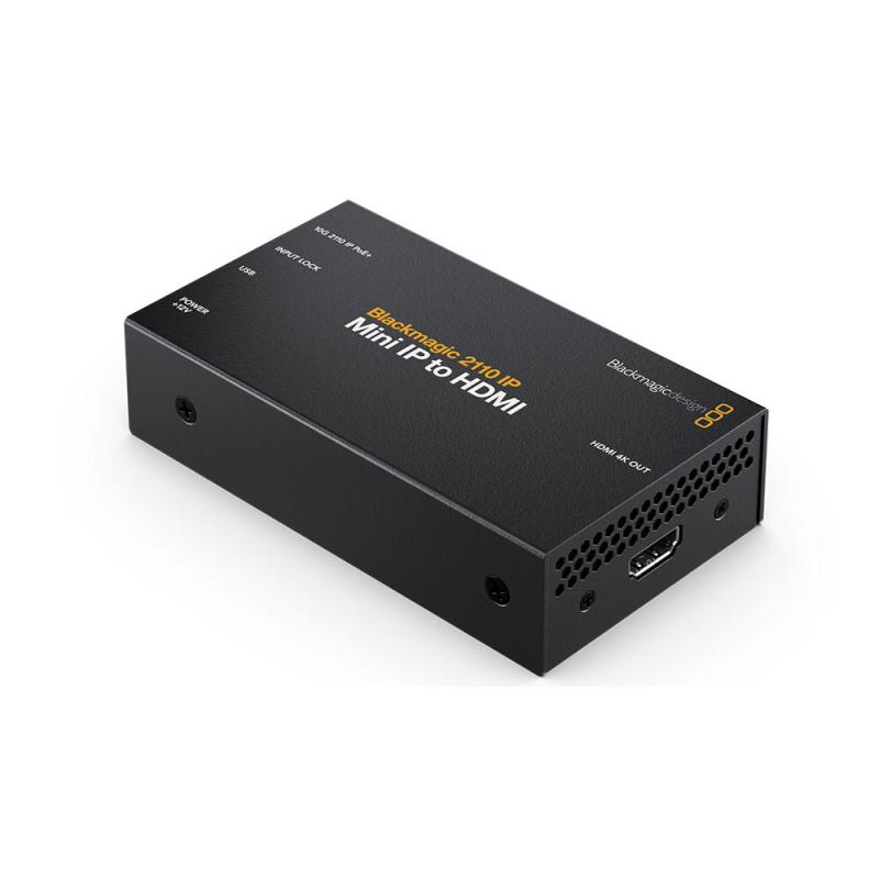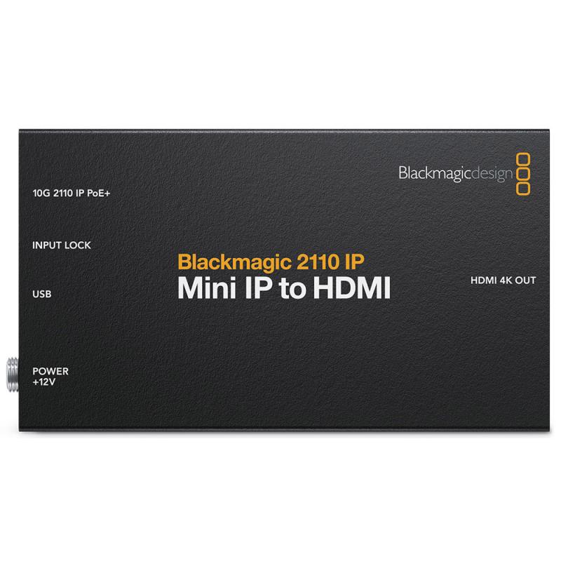 Blackmagic 2110 IP Mini IP to HDMI lets you monitor 2110 IP video and audio on any HDMI monitor or TV. Its compact design means it can be placed behind displays, while it connects and powers from 10G Ethernet and supports HD and Ultra HD standards to 2160p60. Also includes DC power supply.