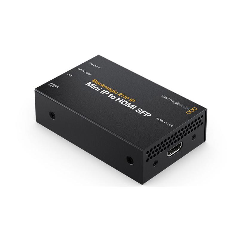 Blackmagic 2110 IP Mini IP to HDMI SFP lets you monitor 2110 IP video and audio on any HDMI monitor or TV over long distances. Its compact design means it can be placed behind displays, while it connects to a standard SFP socket that supports a 10G optical fiber Ethernet module, so you connect it over long distances. Blackmagic 2110 UP Mini IP to HDMI SFP also supports 3G, 6G and 12G optical fiber SDI modules for regular SDI video compatibility. Powers from the included 12V DC power supply.