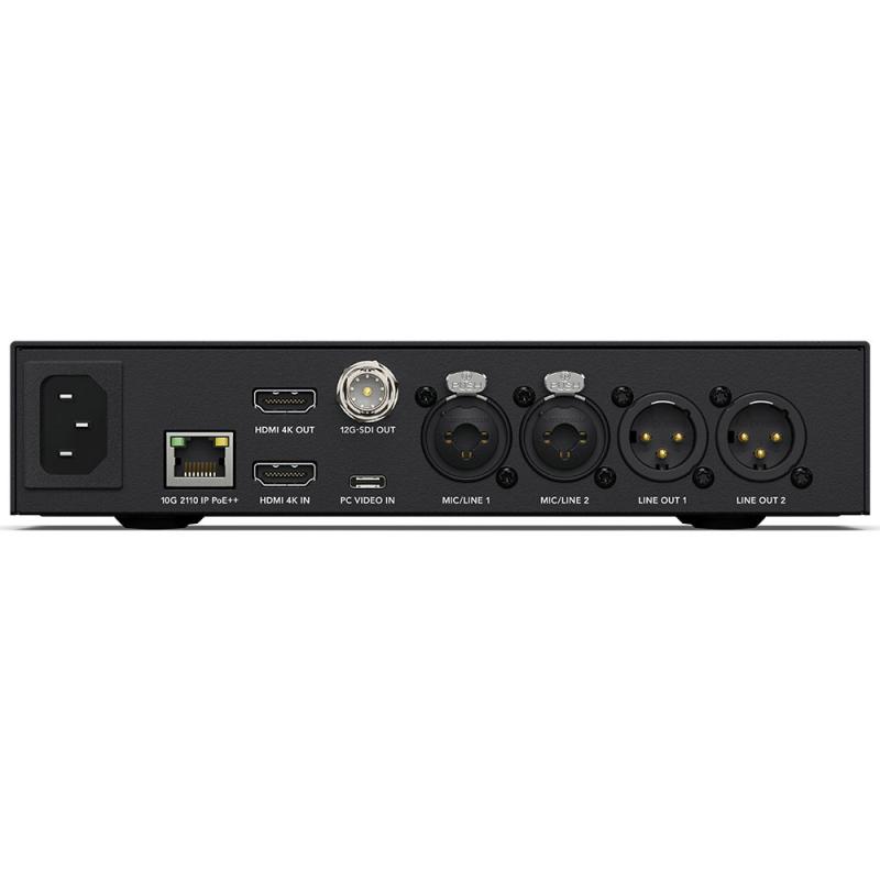 Blackmagic 2110 IP Presentation Converter is designed for speaker podiums with connections for laptops, projectors and microphones all in the one converter. Computers can connect via USB-C for both video and power and there is an HDMI output for projectors that can be switched to the video input or the 2110 IP return feed. For audio, there are XLR microphone inputs and an XLR audio out for PA speakers. The RJ-45 10G Ethernet video connection can power the whole converter, even when charging a USB computer!