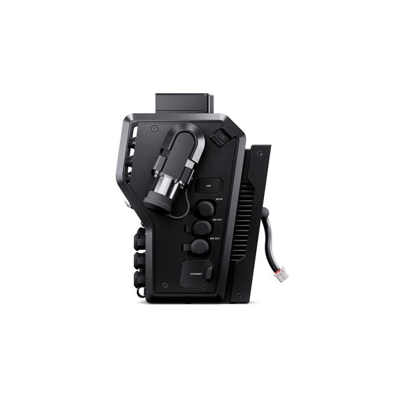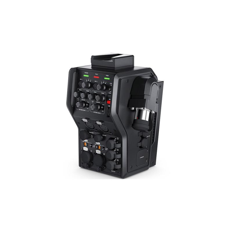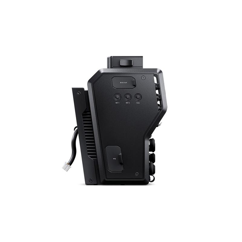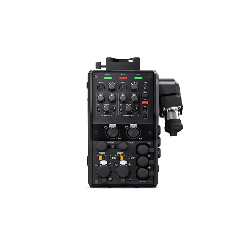 The Blackmagic Camera Fiber Converter attaches to the back of your URSA Mini or URSA Broadcast camera. In addition to converting all of the audio, video, camera control and talkback into fiber, it also adds professional studio camera controls to the back of your camera. You get control for return feeds, dual intercom controls with the ability to mix in program audio, record, focus and iris controls, headset connectors, audio and more. The camera converter also includes a VLock mount plate on the top for attaching accessories such as a professional Blackmagic Studio Viewfinder. The Blackmagic Camera Fiber Converter has connections for your Ultra HD camera feed, 3 HD return feeds, full remote camera control, PTZ, multiple channels of talkback, tally and more.