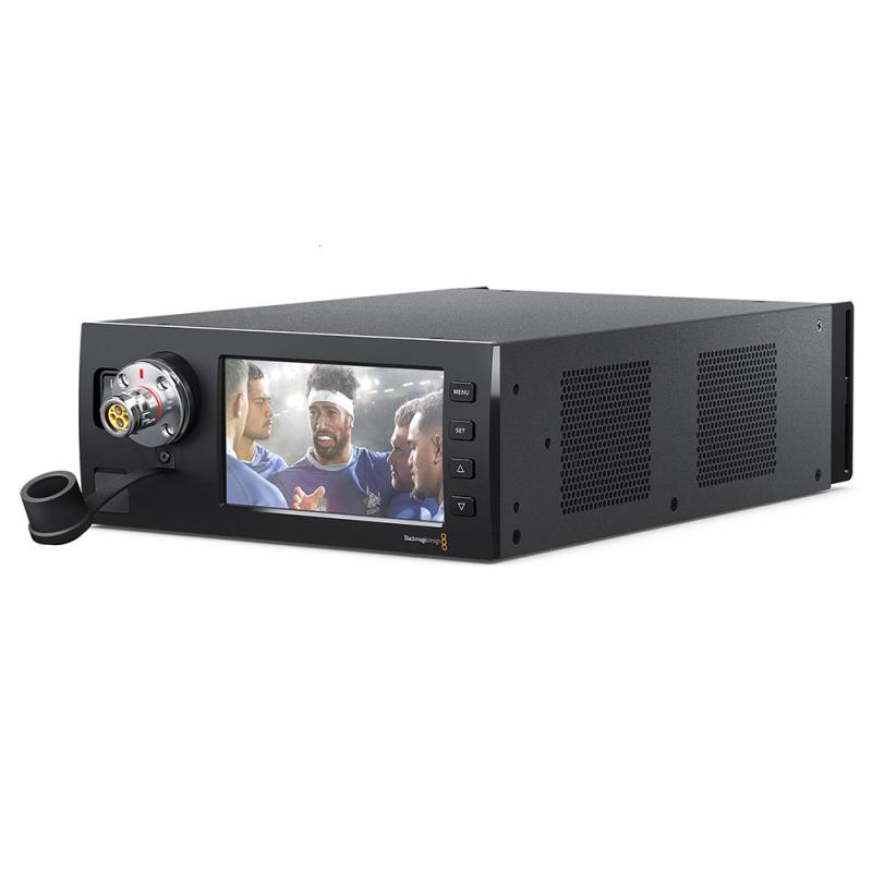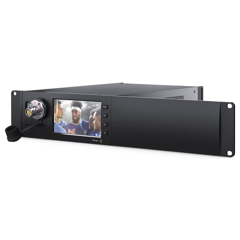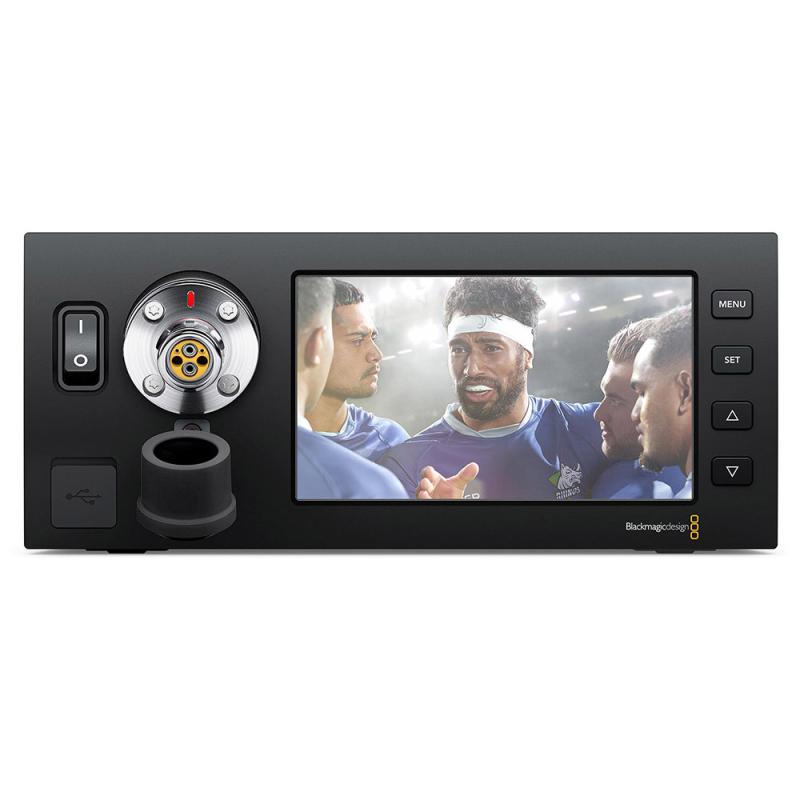 The Blackmagic Studio Fiber Converter is used at the other end of your broadcast camera chain back in the studio or outside broadcast truck. It converts signals from the remote camera back into standard television industry connections that can be used with your live production switchers, audio mixers and talkback interfaces. It features a high capacity power supply to drive the cable so it can provide enough power for your camera and any accessories that you might add. The studio fiber converter includes connections for tally, two dual channel intercoms for industry standard 3rd party talkback systems, and even a backup engineering talkback channel in case the fiber goes down. You get a main Ultra HD camera feed plus 3 independent HD return feeds with full remote camera control, PTZ, tracker talkback and ethernet, all through a single SMPTE fiber cable. Plus, there is a large 5 inch LCD screen right next to the SMPTE fiber connection on the front panel for monitoring signals from the remote camera. This allows for easy patching and verification of the remote camera function.