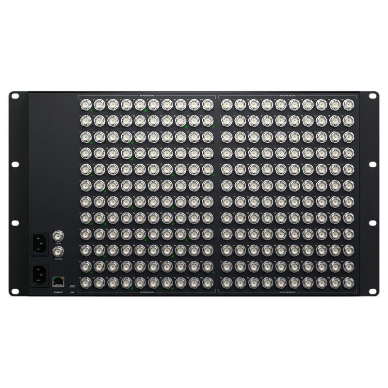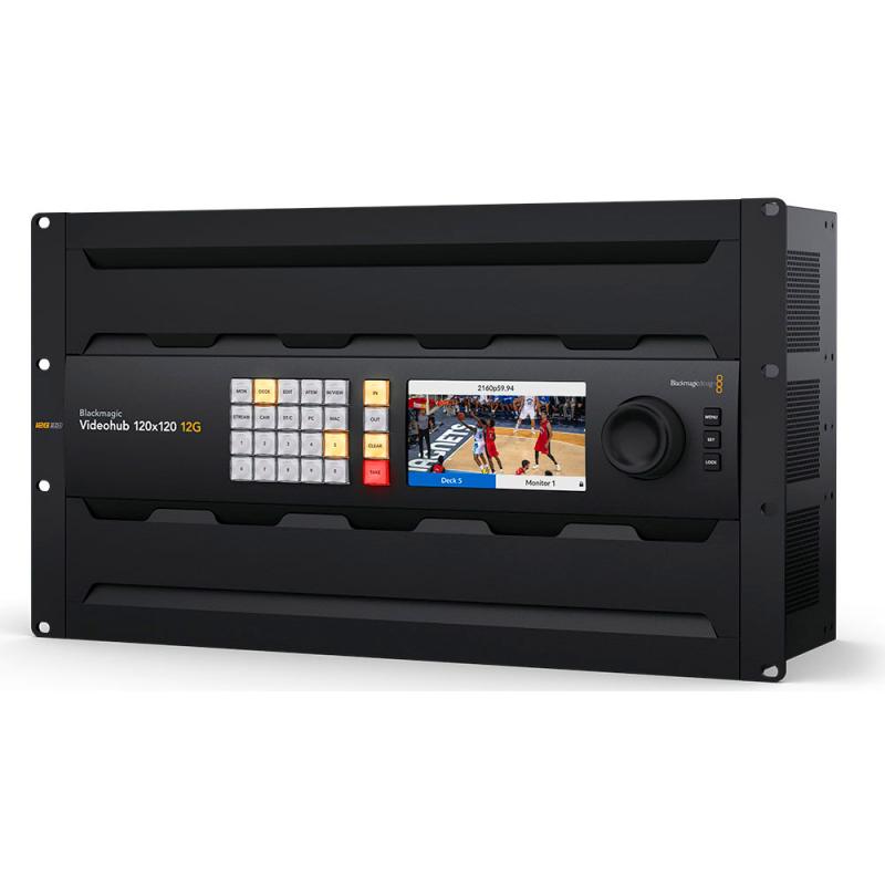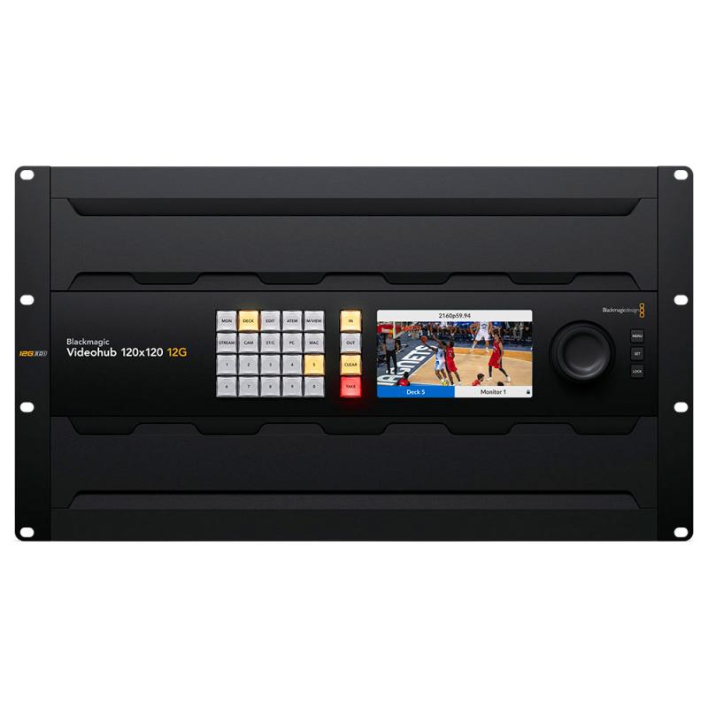 Blackmagic Videohub 120x120 12G is an advanced zero latency video router that supports any combination of SD, HD and Ultra HD on the router at the same time. The 12G-SDI inputs feature LEDs on each BNC that indicate an SDI signal, plus there are 12G-SDI outputs, redundant power and reference connections in a four rack unit design. The large HD LCD lets you see video before routing and clearly displays routing labels and video standards. Routing can be performed by direct button selection and using the large spin knob control that has an electronic clutch. It also features SDI re-clocking, external Ethernet control and supports all SDI video standards up to 2160p60.