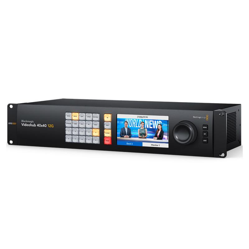 Blackmagic Videohub 40x40 12G is an advanced zero latency video router that supports any combination of SD, HD and Ultra HD on the router at the same time. It has 40 12G-SDI inputs and 40 12G-SDI outputs, redundant power and reference connections in two rack units size. The large full HD LCD lets you see video before routing and clearly displays routing labels and video standards. Routing can be performed by direct button selection and using the large spin knob control that has an electronic clutch. It also features SDI re-clocking, external Ethernet control and supports all SDI video standards up to 2160p60.