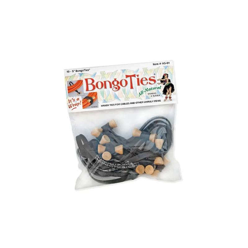 10 pack of BongoTies Black 5" elastic cable ties are ideal for bundling cables and other items. Made of natural rubber and wood to stand up to long-term use.e.