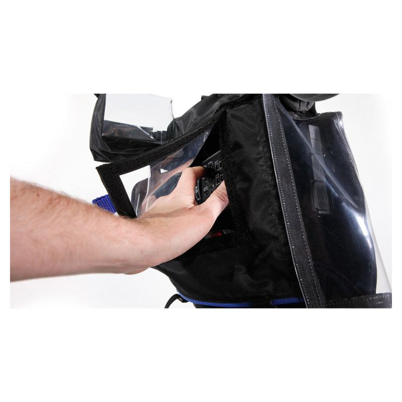 Thanks to its 48 cm (18.9") rubber strip, the rainCover fits correctly to fixed lenses and lens hoods. The strap supplied with a hook-and-loop fastener makes it possible to tighten the cover on the lens hood but still lets you operate the lens, due to its spacious design. With several zippered and hook-and-loop openings you can easily access all essential parts of the camera. From openings for MI shoe connectors, wireless antennas, microphone and viewfinder, to a transparent window on the side for the LCD monitor, this rain cover has it all. The transparent back of the cover easily opens to change the camera's battery or quickly access cables.