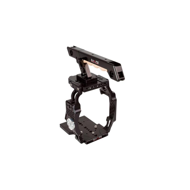 The SHAPE Camera Cage is designed for use with the Canon EOS C200 cinema camera. It is made of CNC Machined aluminum and offers several mounting points and threaded holes to attach other SHAPE parts and third-party accessories. The cage also includes an ARRI rosette on the right side for attaching the Remote Extension Handle or C200 Handle. Bottom section of the cage features an adapter plate with several 1/4"-20 and 3/8"-16 threaded holes, suitable for optimizing your C200 camera balance on a tripod, gimbal, or drone. Top section of the cage features a top plate, allowing you to mount the C200 Top Handle at different positions to optimize your balance when shoulder-mounted. Finally, you can quickly adjust or remove the cage with the help of an Allen key, included and magnetically attached to the bottom of the cage.