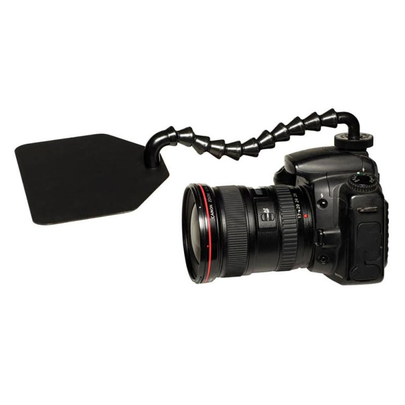 The COMPACT™ lens shade is a professional “french flag” for DSLR’s and small video cameras. Securing to the hot-shoe bracket, the multi-directional 10 link, 19 cm long ball-and-socket arm holds the sturdy 12 cm wide aluminum shade securely and precisely to protect from lens flare, dust, and drizzle. Fast set-up and ease of use make this an essential item to add to the kit of every serious photographer or videographer, saving time and money by eliminating the need for hoods specific to every lens.