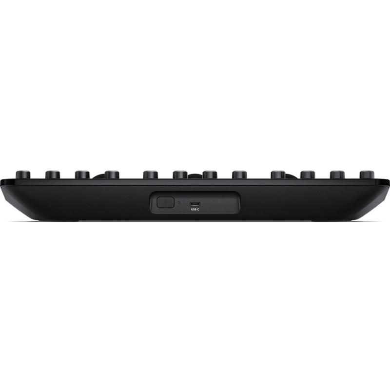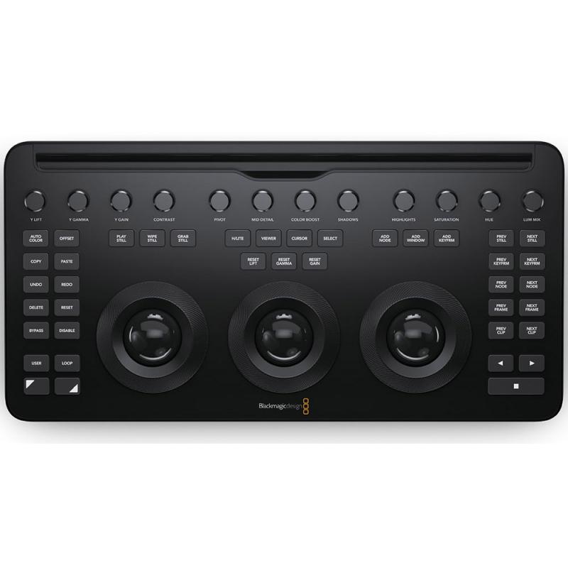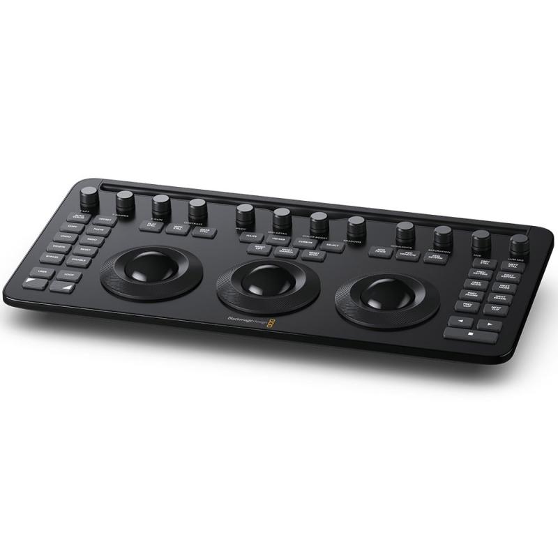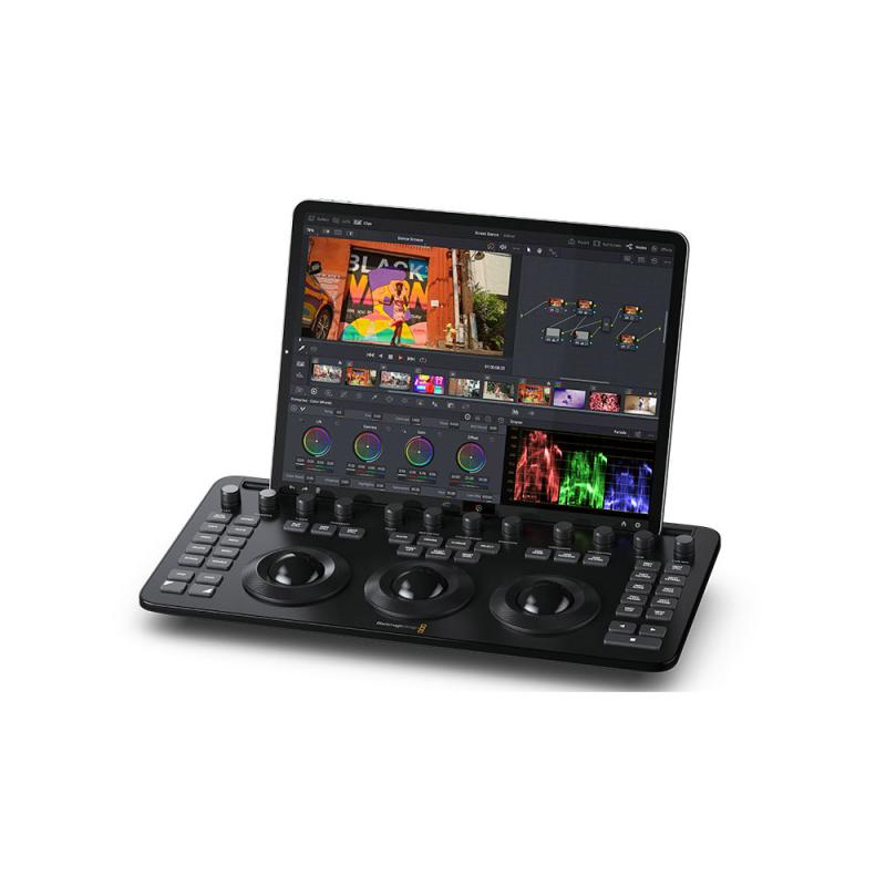 The DaVinci Resolve Micro Color Panel is a compact yet powerful color panel that gives you all the control you need to create cinematic images. The Micro Panel features a row of direct control knobs at the top of the panel, three trackballs with rings for color grading and transport keys to speed up your grading session. Includes controls for refined color grading including adding windows and a tablet slot designed to hold an Apple iPad. Connects via Bluetooth or USB-C.