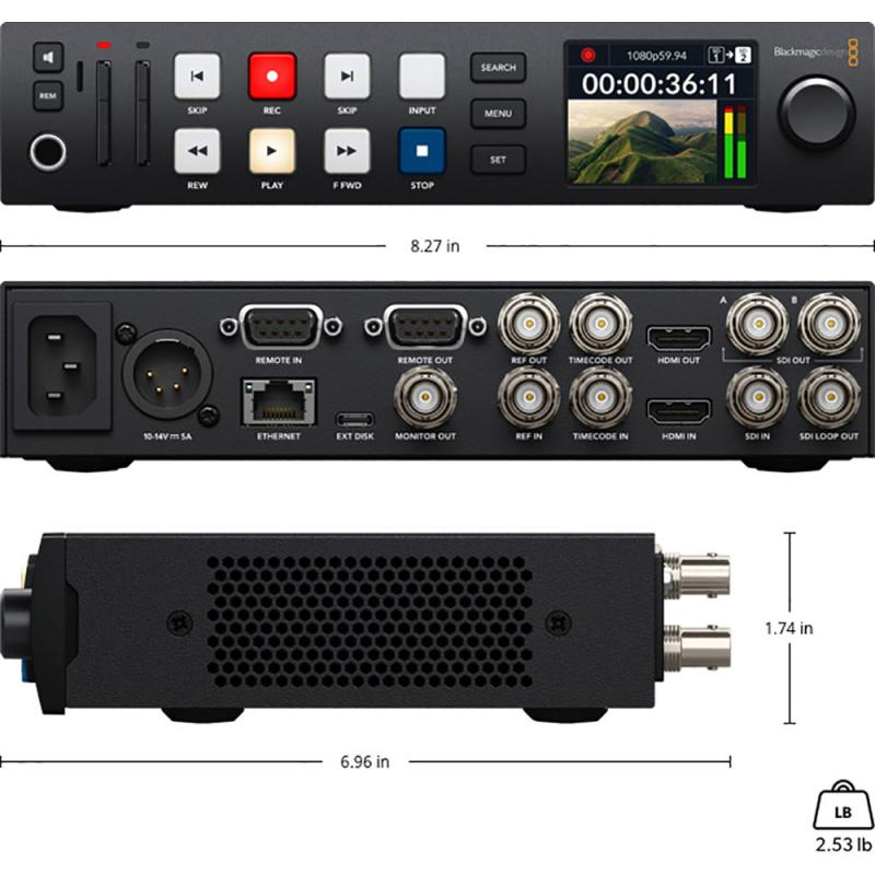 HyperDeck Studio HD Plus includes all the features of the Mini model, but is larger so it has more space for extra controls and extra connections. This model adds 6G-SDI so it can record and playback ProRes up to Ultra HD 30fps, and it includes an SDI loop out and HDR support. Plus the two 6G-SDI outputs allow fill and key playback up to 1080p60. There is also an HDMI input and a dedicated 3G-SDI monitoring output with overlays. Any button pushed on the front panel is sent to a dedicated RS-422 remote output and the DC power is now a broadcast style XLR connector. The front panel is also upgraded with better transport control buttons, a headphone socket and built in speaker.
