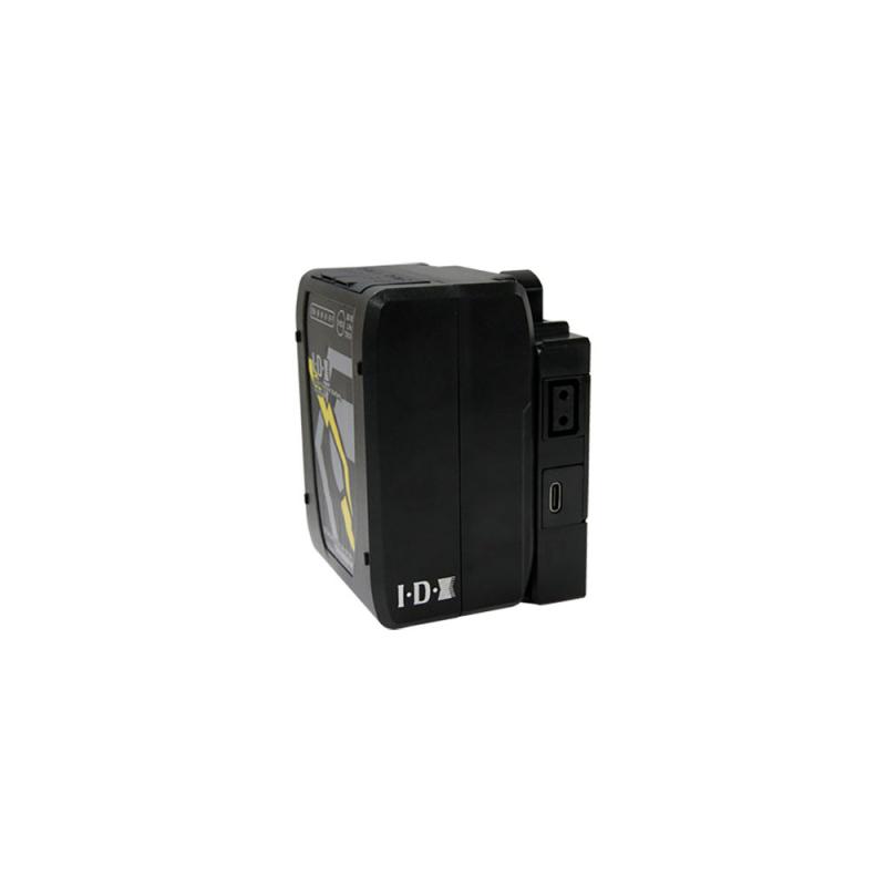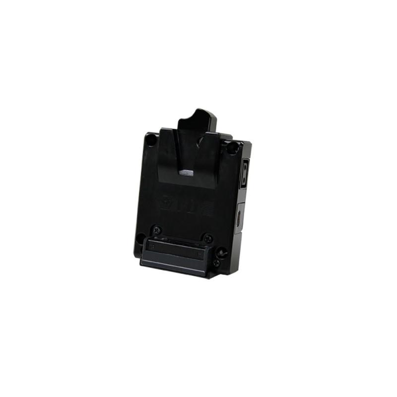 A compact V-mount plate with DC outputs available on 2 × D-Tap and 1 × USB-C at 5.0 volts.