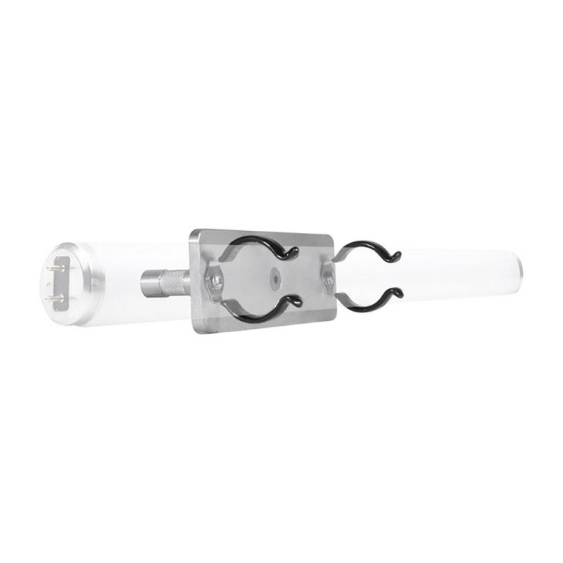 Designed with rubber covered clips to hold (1) fluorescent T12 tube. Terminates in a baby (5/8) pin. Made from 6061 aluminum. Works for quasar tubes.