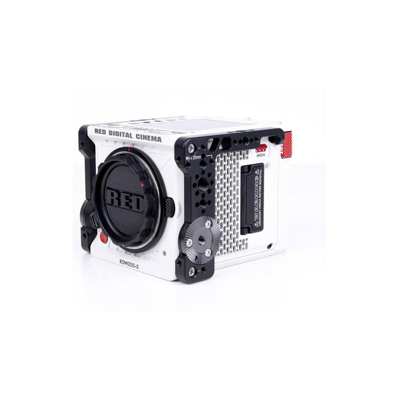 Left Side Plate for RED KOMODO and KOMODO-X attaches to the side of the RED Komodo or Komodo-X and provides 1/4-20, 3/8-16 with ARRI locating pins, an ARRI standard rosette, and M4x20mm threaded holes. Contoured shape prevents users from accidentally hitting the media door button on Komodo-X.