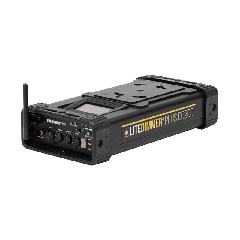 LiteDimmer+ Plus DC200 Duo is one of LiteGears flagship Plus Series power units. Compatible with all LiteMat+ Plus, LiteTile+ Plus, and all Plus compatible lighting products, the new Plus Dimmer features a large OLED display that provides visual feedback, and integrated wireless radio that acts as both a transmitter and a receiver for the ultimate wireless convenience. The dimmer also comes with advanced features such as load smoothing, local cueing controls, double circuit control, and a special Master/Slave function that utilizes the integrated wireless card. The unit includes ¼-20 threaded inserts that make rigging or mounting a simple task. The unit also feature K-mount fittings used for attaching battery adapters, mounts, and power supplies.