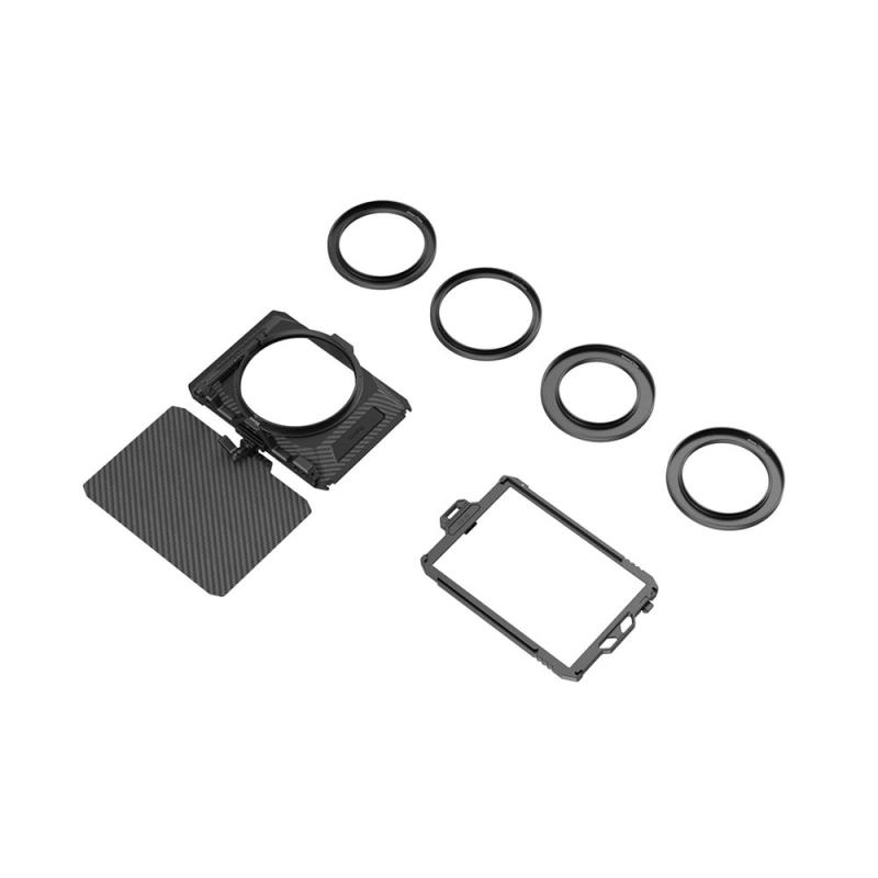 SmallRig mini Matte Box 3196 is designed for DSLRs and mirrorless cameras to prevent sunlight or other light from causing glare and flare for controlling images on the screen. Its clamp connector works with adapter rings in various sizes (52-95mm; 55-95mm; 58-95mm; 62-95mm; 67-95mm; 72-95mm; 77-95mm; 82-95mm; 86-95mm) or can be attached directly to 95mm lens; its adapter ring fits circular CPL, ND filter and other circular filters of up to 92.5mm. The filter tray 3319 can be quickly mounted onto the matte box via a NATO clamp and supports multiple 4 x 5.65" plug-in filters of up to 4mm in thickness. The filter tray 3320 (purchase separately) can be quickly mounted onto the matte box via a NATO clamp and supports multiple 4 x 4" plug-in filters of up to 4mm in thickness at the same time. It is easy to store and prevent scratches and fingerprints while replacing plug-in filters. The adjustable carbon-fiber top flag blocks sunlight or strong light and also prevents internal reflections with its anti-reflective design. Top 1/4"-20 threaded holes enable easy attachment of other accessories and anti-twist 1/4"-20 threaded holes on the bottom suit 15mm LWX Rod Support 3411.