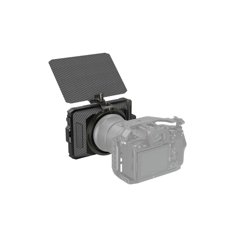 SmallRig Mini Matte Box Lite 3575 is designed for DSLRs and mirrorless cameras to prevent sunlight or other light from causing glare and flare and to control images on the screen. Its clamp connector works with adapter rings of various sizes (52-95mm; 55-95mm; 58-95mm; 62-95mm; 67-95mm; 72-95mm; 77-95mm; 82-95mm; 86-95mm) or attached directly to 95mm lens; its adapter ring fits CPL, ND filter and other circular filters of up to 92.5mm. Using filter tray (ID: 3319/3320) can quickly install with 4 x 5.65"/4 x 4" plug-in filters of 4mm in thickness. Easy-to-store filter tray (ID: 3319/3320), which can be quickly mounted onto the matte box via a NATO clamp, supports multiple 4 x 5.65"/4 x 4" plug-in filters of 4mm in thickness at the same time, protects filters from accidental drops and prevents scratches and fingerprints while replacing plug-in filters. The adjustable carbon-fiber top flag blocks sunlight or strong light and also prevents internal reflections with its anti-reflective design.