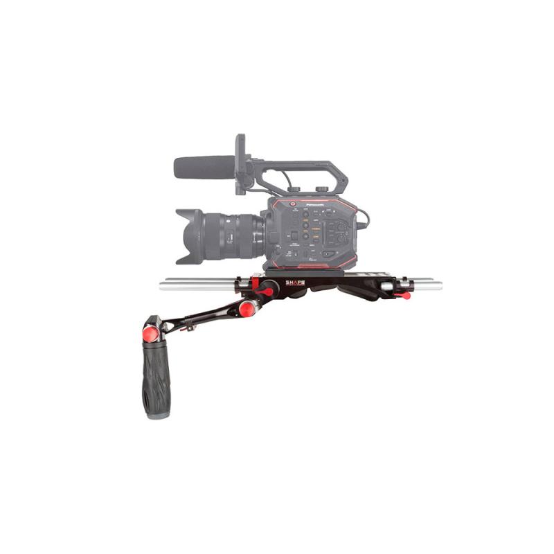 The SHAPE Bundle Rig for Panasonic AU-EVA1 is a camera support system designed for the AU-EVA1 and suitable for handheld or shoulder-mounted shooting. It includes the BP0008 V-Lock Quick Release Baseplate with 8" and 4" 15 mm rod pairs, the V-Lock Replacement Pad, and the HAND3 Telescopic Handle for ARRI rosette.