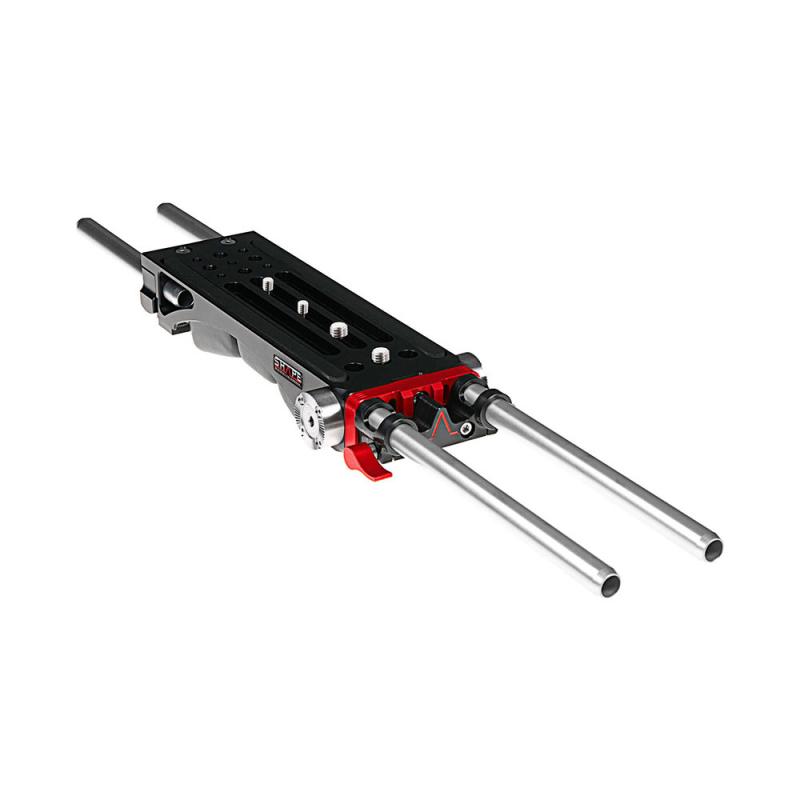 The SHAPE BP0008 V-Lock Quick Release Baseplate is a long format baseplate for larger cameras like the Alexa, F5, C300, and broadcast cameras. It can be used shoulder mounted, tripod mounted, and attached to V-lock Tripod & Fluid Head Adapters. It should be used with cameras with external viewfinders. The baseplate includes a removable shoulder pad and features rosette adapters for ARRI standard handles. It has 1/4"-20 and 3/8"-16 tripod mount threads and a V-lock delta adapter for attaching SHAPE VCT Tripod Plate (VCTSH) or any VCT-14 tripod plate. The shoulder pad secures on by touch fasteners. The tripod mount threads are located underneath the shoulder pad. Two pairs of 8" and 4" 15 mm rods are included for the front and back. For attaching a matte-box and other accessories, the rod adapter can be adjusted vertically if you remove the screw holding it in position. This baseplate also supports optional SHAPE 15 mm Studio and 19 mm Studio adapters in place of the included one. The baseplate features three camera mount slots, all supporting 1/4"-20 and 3/8"-16 screws. The off-center slots allow you to mount your camera offset if you use a 15 mm Studio Adapter. Multiple 1/4"-20 and 3/8"-16 mounting threads are peppered behind the three slots for attaching articulating arms and other accessories. Two 1/4"-20 and two 3/8"-16 camera mount screws are included.