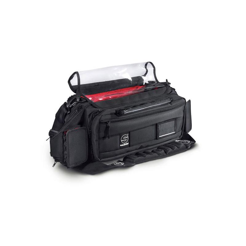 Large ultra-lightweight audio bag with transparent top window, multiple configuration options and storage pockets, with padded adjustable shoulder strap for comfort whilst working.