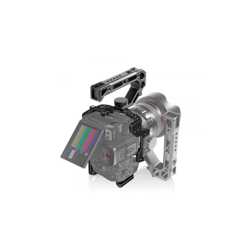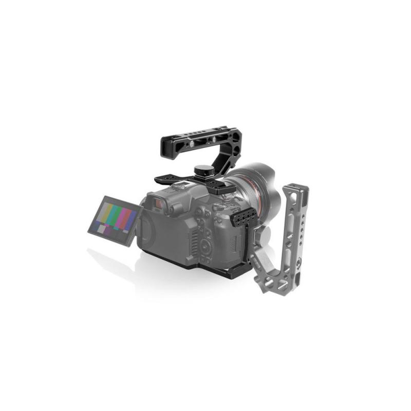 Made of CNC-machined aluminum, the cage is specifically designed for the Canon R5C,R5 and R6 cameras. The camera is mounted to the cage using a 1/4-20 screw. The cage is designed with several 1/4-20 threaded holes and seven 3/8?-16 threaded holes with anti-rotating Arri hole patterns. The design of the cage also allows easy access to all control buttons, side outputs, the memory card, the battery compartment, the lens release button and the camera hot shoe for the audio unit system. All doors and locks are fully usable when the camera is in the cage and its intelligent design allows you to operate the camera without having to remove the cable doors. In addition, the strap hooks can remain attached to the camera while being inserted into the cage. A detachable lock system to secure and hold in place your 4K Micro HDMI to HDMI cable is included with the cage. The bottom of the cage has three 1/4-20 threaded holes to mount a quick release tripod plate to switch from a tripod to a shoulder configuration. The aluminum top handle included with the cage offers cold shoe mounting options for additional accessories. A second top handle can be added and attached on the sides of the cage for vertical shoots.