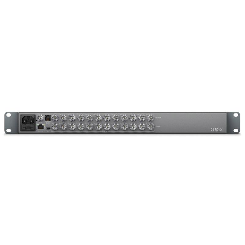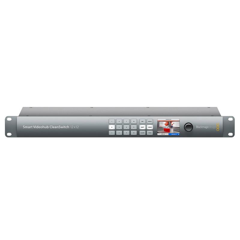 This Compact 6G-SDI router from Blackmagic Design with built in re-synchronizers on all inputs allows clean switching between all video sources of the same video standard, and can be used as 12 re-synchronizers for automatic re-timing of SDI feeds. Smart Videohub CleanSwitch supports 12 inputs and 12 outputs in virtually all SD, HD and Ultra HD video formats. Supports multiple formats on the same router at the same time and will clean switch between multiple formats that match the reference frame rate when the switching is between the same video standard. Includes front panel button and spin knob routing, elegant machined metal front panel with LCD for routing display and video monitoring and remote Ethernet control.