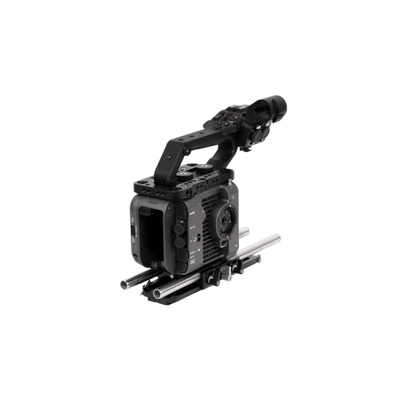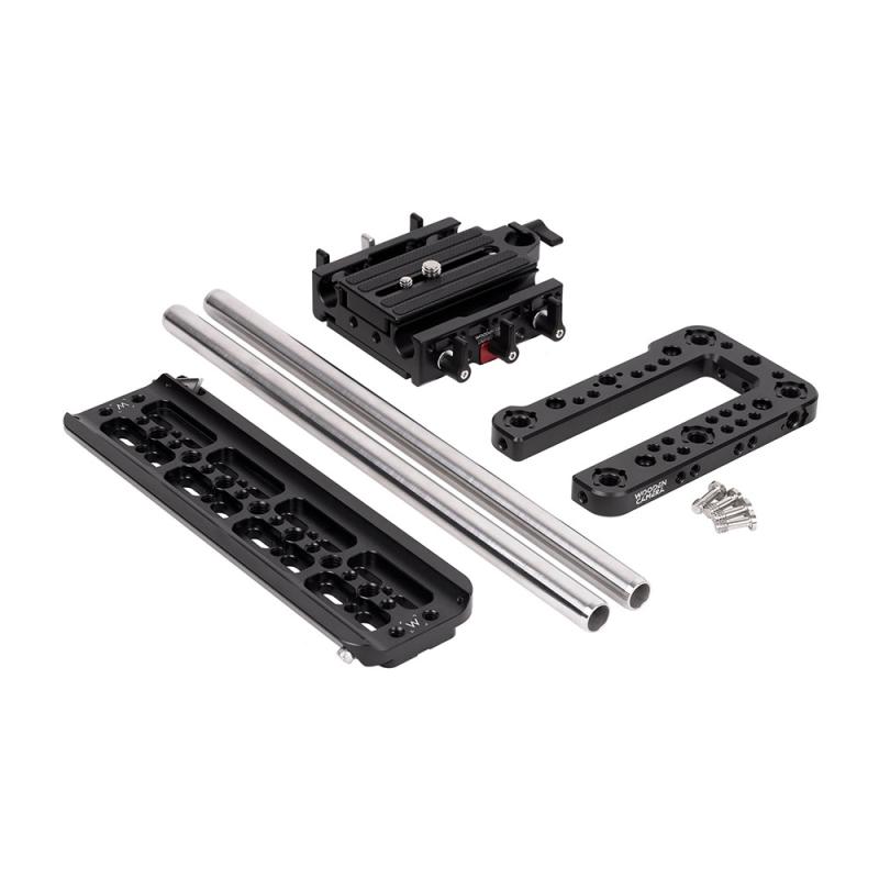 The Sony FX6 Unified Accessory Kit (Advanced) is a professional camera support package designed for the Sony FX6 camera and utilizes the Wooden Camera Unified Baseplate System. The FX6 accessory package includes: Top Plate (Sony FX6), a top mounting camera cheeseplate for accessory attachment, Unified Baseplate (Sony FX6), a camera baseplate for holding the two 15mm Rod (12") at the correct lens height, Safety Dovetail (8") which interfaces with the ARRI dovetail slot on the bottom of the Unified Baseplate.