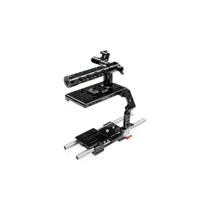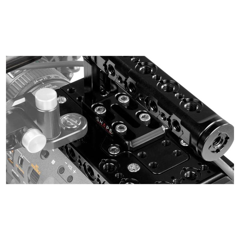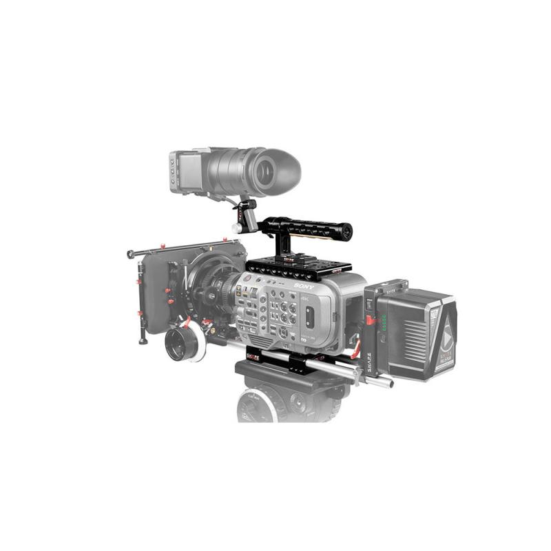 Add accessories and handheld functionality to your Sony PXW-FX9 camera with this rig kit from SHAPE. It includes a baseplate with 15mm rod system, a form fitting side plate with Arri rosette , a top plate, a rear insert plate, a top handle with several threaded holes, and a viewfinder rod clamp with 19mm push-button. The baseplate match the Sony FX9 optical center and can also be tripod-mounted. The rear insert plate attaches to the rear of the camera to support it on the baseplate. The 15mm 12" rods allow you to mount additional accessories.