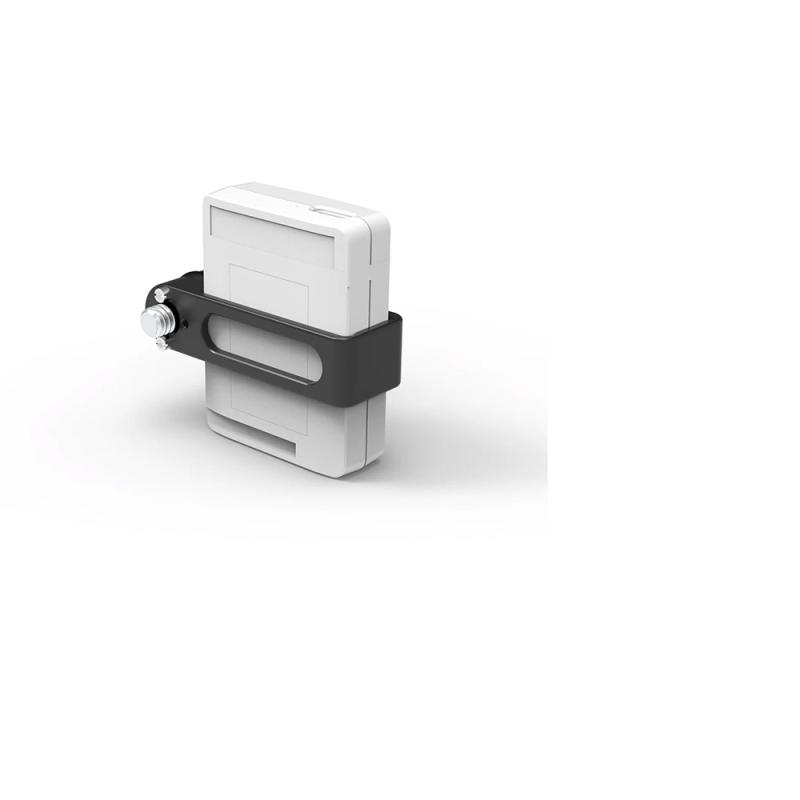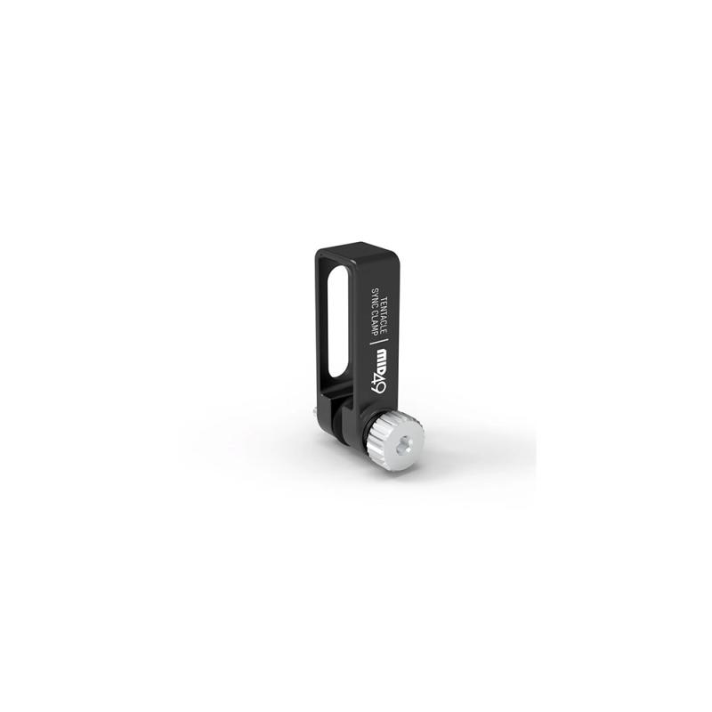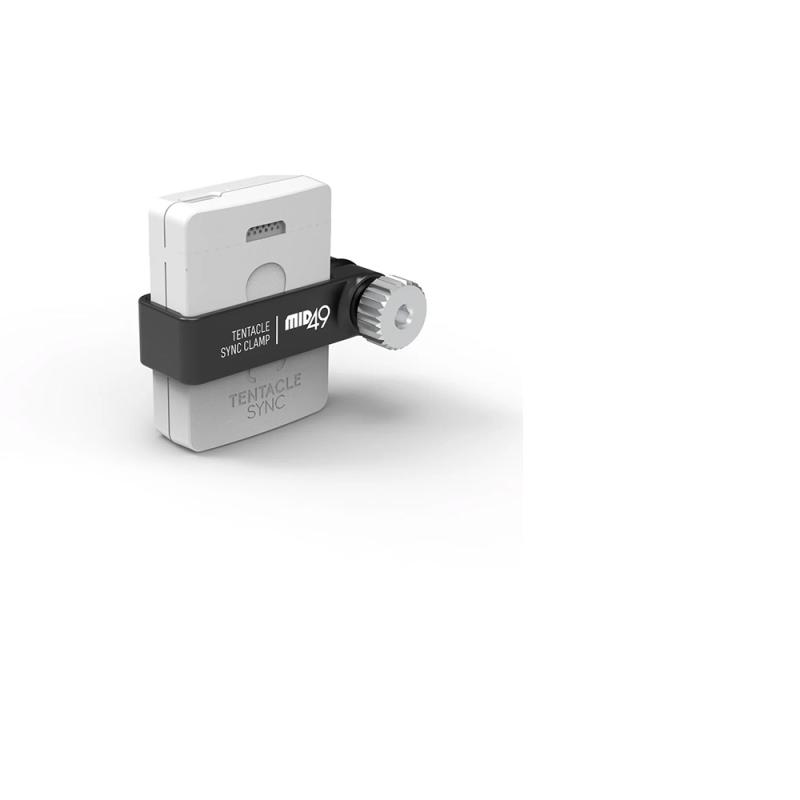 Tentacle Sync E Clamp attaches to an ARRI 1/4-20 with locating pins adjacent using a captive thumbscrew. The clamp can be configured in several ways depending on the desired position, and the locating pins can be removed if needed.