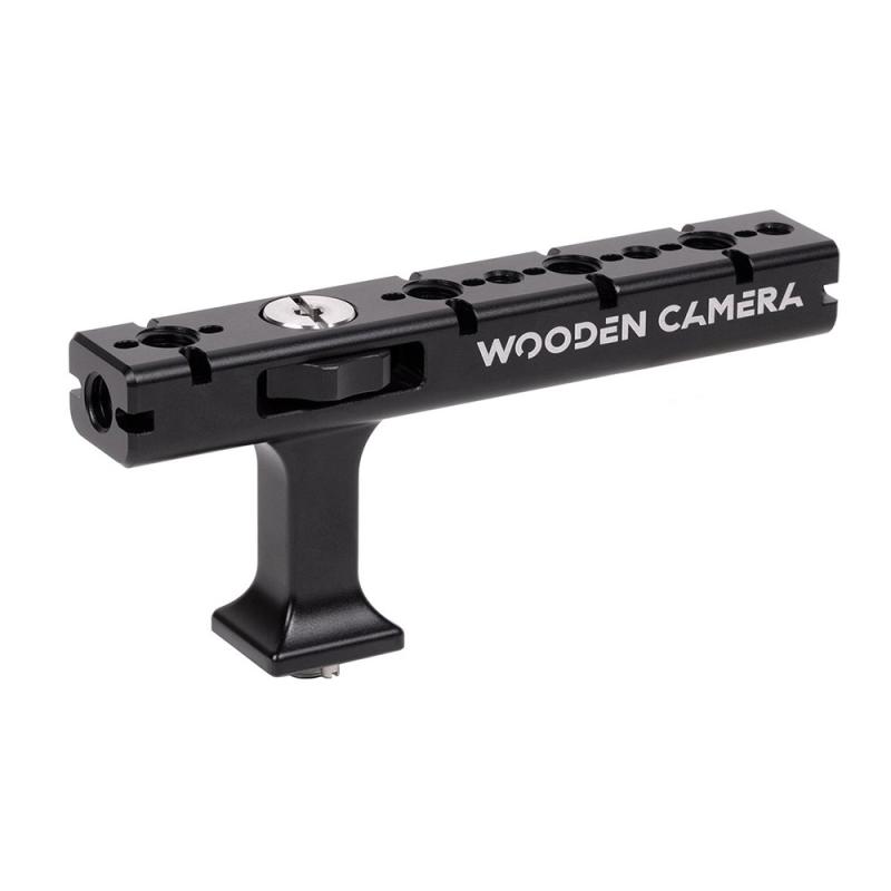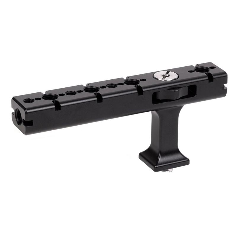 Top Handle (3/8-16) is a compact, lightweight top handle that features an array of 1/4"-20 and 3/8”-16 mounting points with ARRI locating pin compatibility. The minimalist design consists of an ergonomic metal grip that can be attached to any 3/8"-16 mounting point. The handle utilizes a versatile captive 3/8"-16 bolt-on mechanism with removable safety pins for mounting which can be tightened with either a flathead screwdriver, 5/32” Allen, or 4mm Allen Key. Top Handle (3/8-16) is 5.12in (130mm) end to end.
