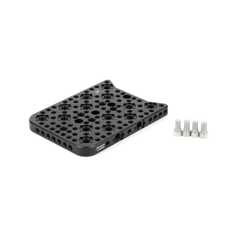 Top Plate (URSA Mini) is a top mounting cheese plate for Blackmagic URSA Mini Camera. Attaches to camera top by (4) 1/4-20 screws. Arrays of 1/4-20 holes in standard 9mm spacing and multiple 3/8-16 holes for large accessories. ARRI accessory mount also available in several places (3/8-16 screw hole with locating pins adjacent). Includes tape hook for accurate focus measuring. Original Blackmagic handle can be reinstalled on the Top Plate using center 1/4-20 threaded holes. Compatible with the URSA Mini Pro Camera. Includes: (4) 1/4-20 socket cap screws