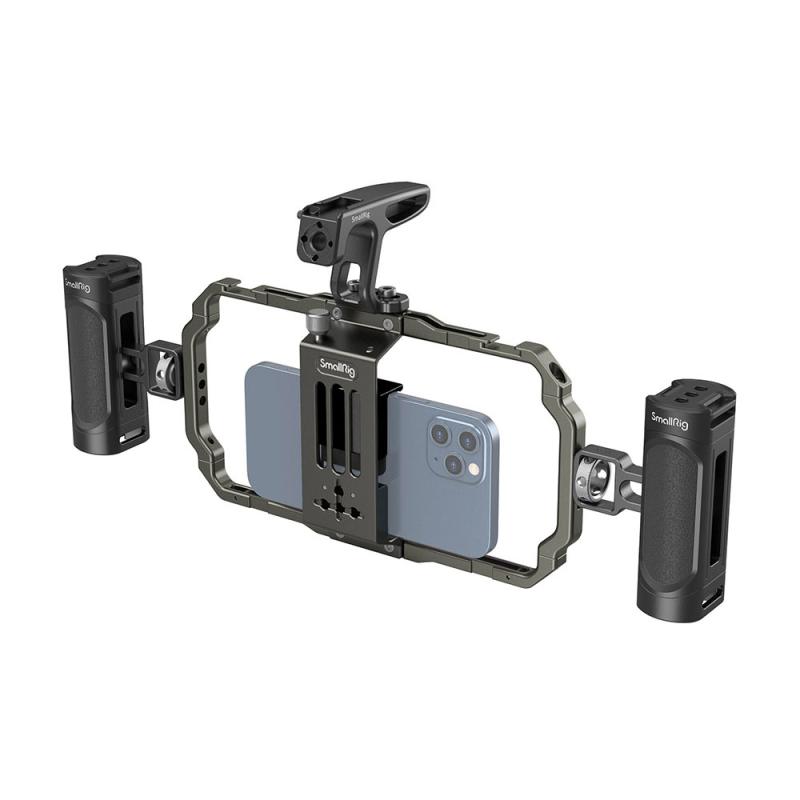 SmallRig Universal Mobile Phone Handheld Video Rig kit 3155 is a perfect mobile phone video rig for vlogging, mobile filmmaking, commercials, etc. It's compatible with mobile phones with a width range from 62mm to 86mm, with or without a case. The kit comes with two side handles and a top handle for a more stable handheld phone shooting. It features two cold shoe mounts and multiple 1/4 threaded holes to attach accessories like a microphone, a LED light, a tripod, etc.