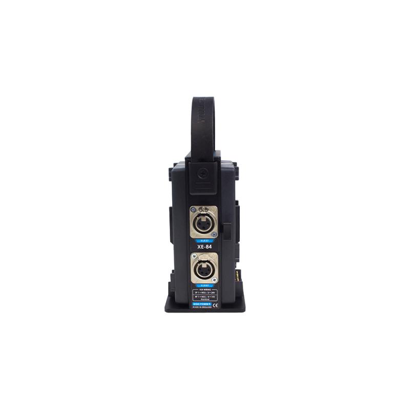 The XE-84 supports a XLR 4-pin output which provides nominal battery voltage along with a 24v Step-Up XLR 3-pin output to run high-powered equipment. Two Power-con outputs are also standard with the camera fittings.